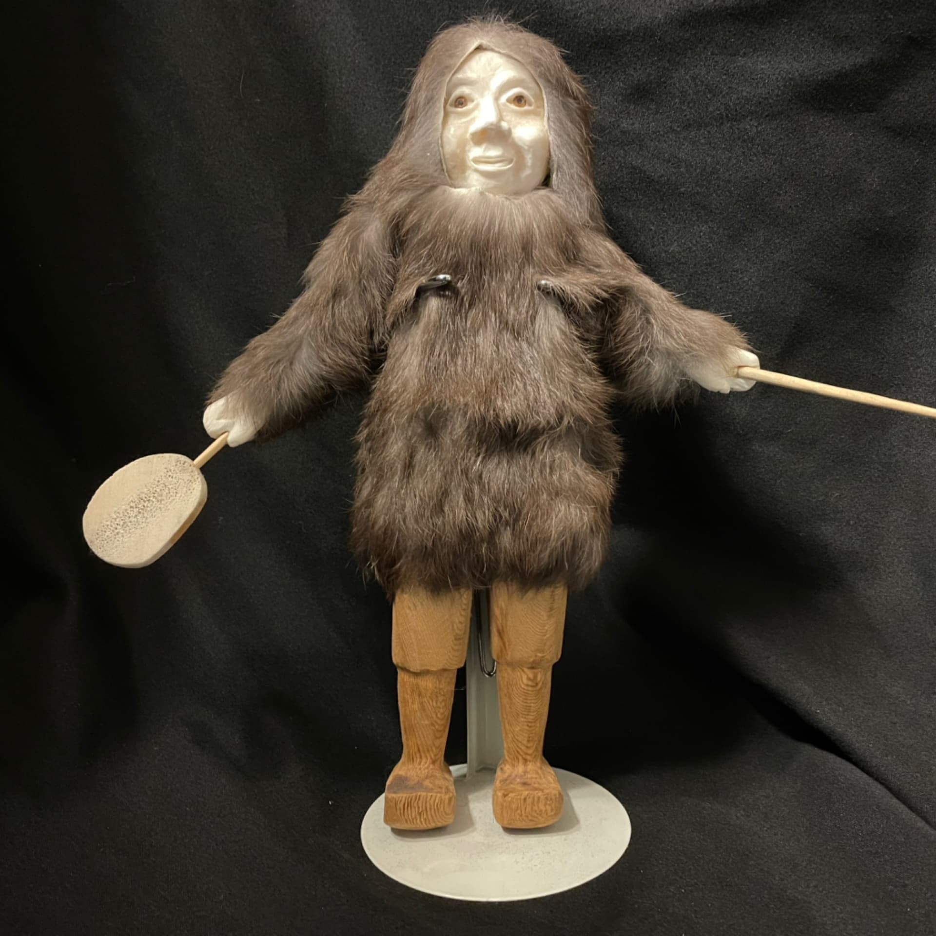 Ivory face doll with antler drum and ivory drumstick wearing rabbit clothing made by Cup'ik artist Franklin Matchian from Chevak.