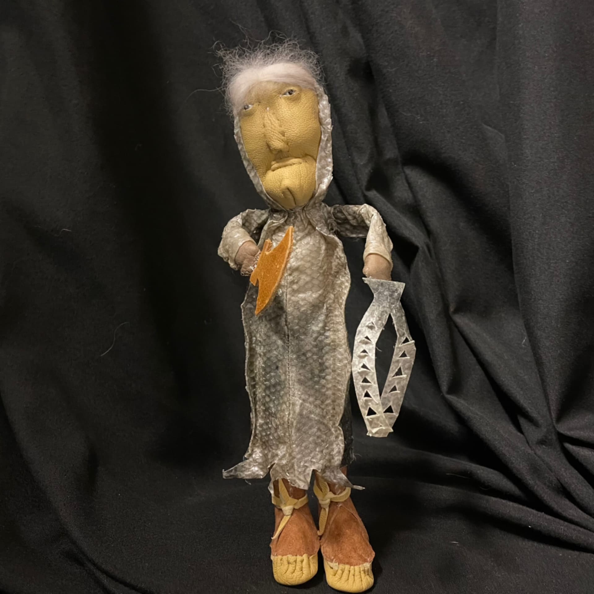 Fish skin doll holding ulu & cut salmon for drying. Cup'ik artist Mabel Achak Pequeno from Chevak.