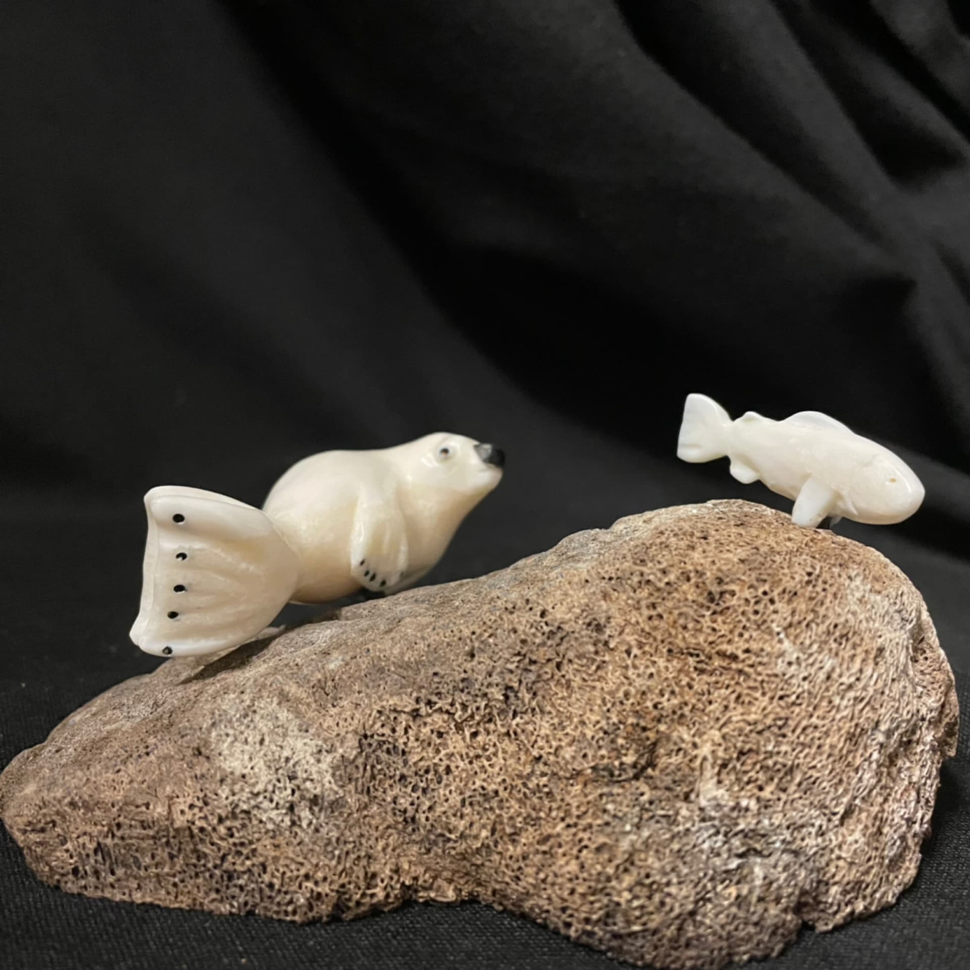 Ivory seal chasing fish carving by Alaska Native artist Kalookie Wilson.