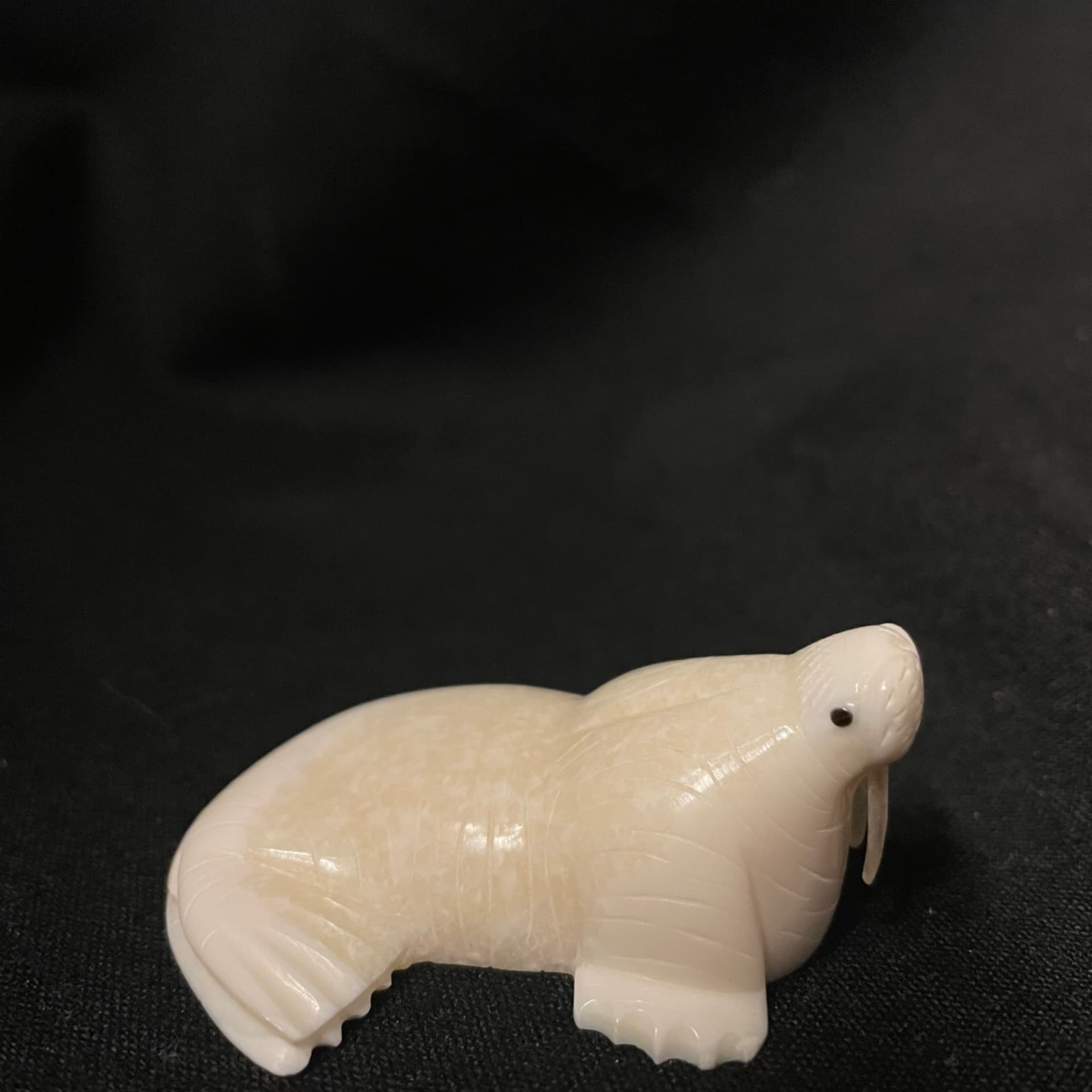 Ivory walrus with baleen inlayed eyes and walrus whiskers carved by St. Lawrence Island Yupik artist Charles Slookoo from Savoonga.