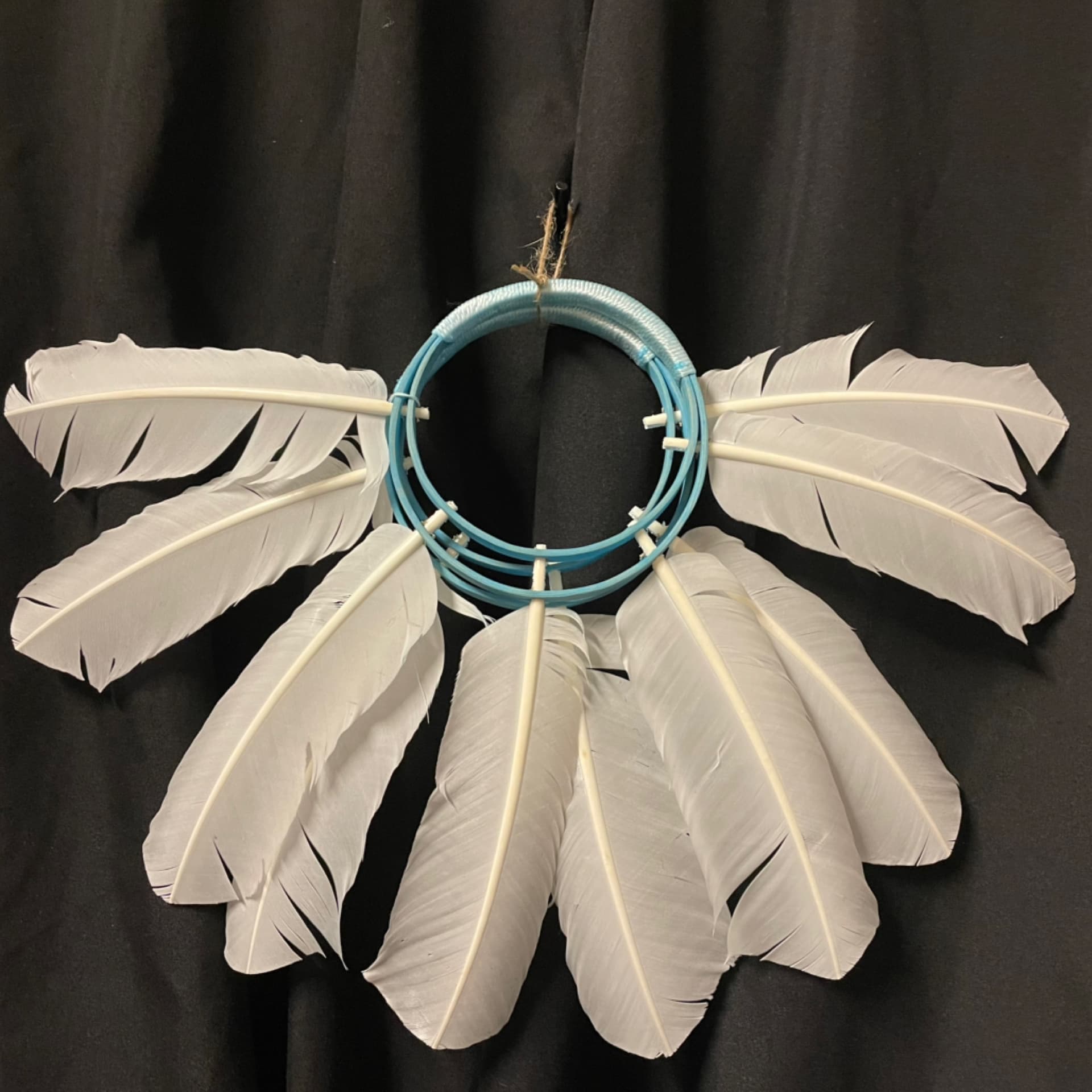 Turkey feathers to imitate snowy owl feathers, materials blue vivianiteolor the steam bent handles. Minerals were gathered in Bethel. Yup'ik artist Mike McIntyre from Bethel.