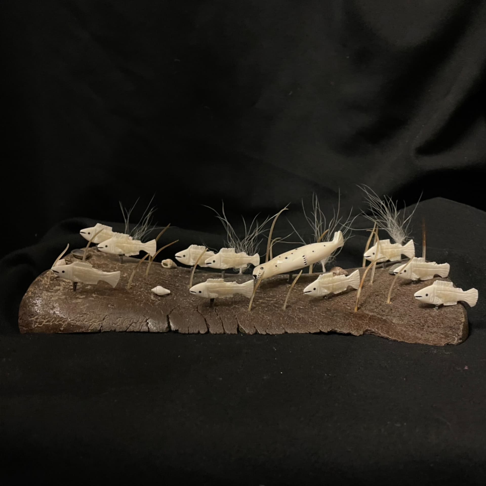 Seal chasing salmon scene with ivory walrus whiskers, polar bear fur on mammoth whale bone base. St. Lawerance Island Yupik and Tlingit artist Robert Apangalook from Gamble.